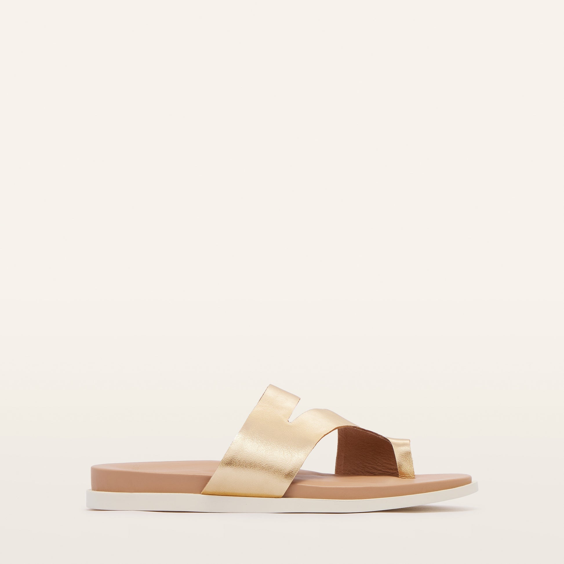 Take your warm-weather looks somewhere unexpected with Riviera in luxe Gold Tumbled. Featuring supple leather, striking asymmetrical design, and elegant toe-loop. With a triple-layered support and cushion system, and durable rubber soles, Riviera’s classic slide design isn’t just flattering, it’s made for high-rotation style.